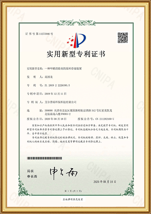 實(shí)用新型專利證書(一種甲醛清除劑的原料存儲